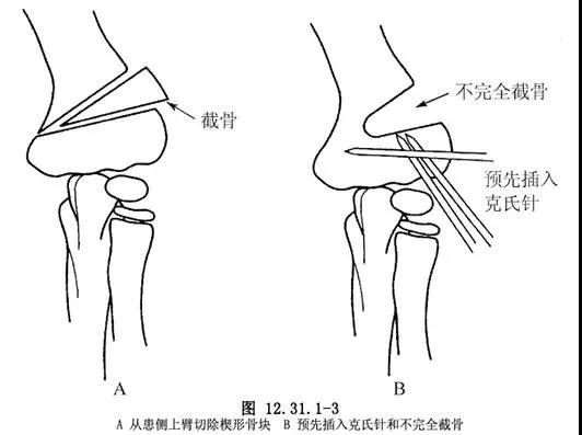 手术有多种方式,最基本的都是要通过髁上截骨。截骨术包括3个基本类型:内侧开放性楔形截骨与骨移植、斜行与旋转截骨和外侧闭合性楔形截骨。外侧闭合性楔形截骨是最安全、最容易的,并最具内在稳定的截骨方法。