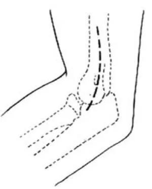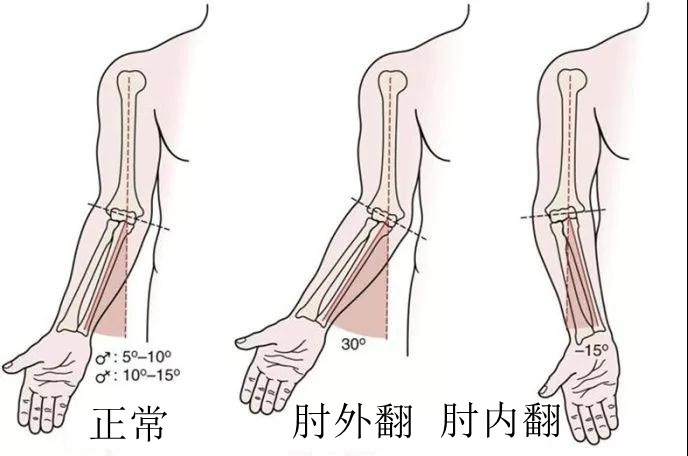 正常情况下,我们正常的肘关节自然肘外翻的角度的,正常范围在10~15度,我们称为“提携角”。(正常人的上肢不是直的,前臂相对于上臂是向外偏的)