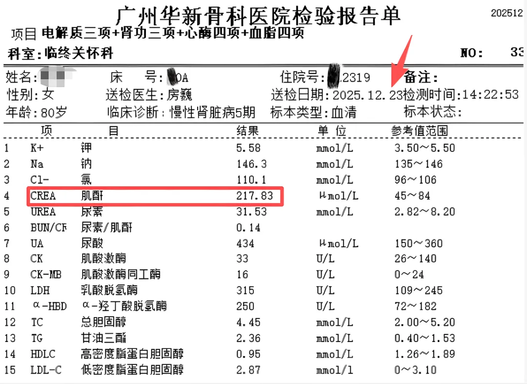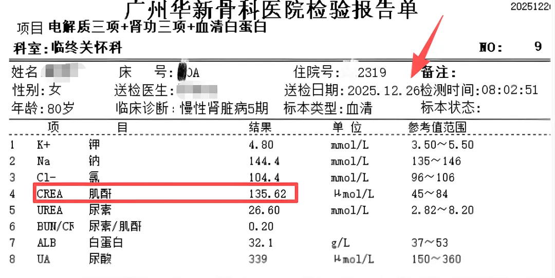 2025年12月23日,华新骨科医院临终关怀科接收了一名从外院转入的需要定期行CRRT(连续肾替代治疗)的老年患者,患者从2005年5月开始卧床、肺部感染,慢性肾功能不全4期因感染出现急性肾损害(AKI)出现无尿状态需要定期行CRRT治疗,因此近半年来反复在各大医院寻找可以行CRRT的治疗的住院单元转诊治疗,特别是近3个月开始病情逐渐加重后液体正平衡及热量消耗明显增加,不仅需要定期行CRRT治疗更是需要定期输注人血白蛋白以维持血清蛋白水平,既增加了家属的麻烦也增加了经济的负担。入院前1天,患者完成持续24小时的CRRT治疗,且尿量<100ml,因此家属最终决定放弃定期CRRT治疗,转入我院临终关怀科。