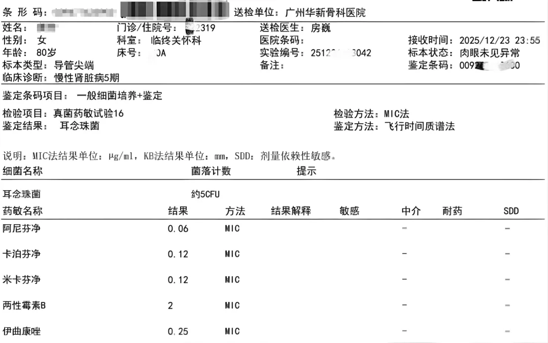 第三天(12月日26)复查肾功能的时候,患者肌酐和尿酸值均明显下降(图2),我们初步认为患者似乎可以不用进行定期的CRRT治疗了,家属也开始出现了笑容,如果患者病情进一步平稳,待病原学结果出来后按照药敏结果使用抗生素(图3);假如患者不再发热,不再使用血管活性药物的话,医疗花费将进一步减低,患者将从不断转院寻找CRRT病房的循环中得到解放。