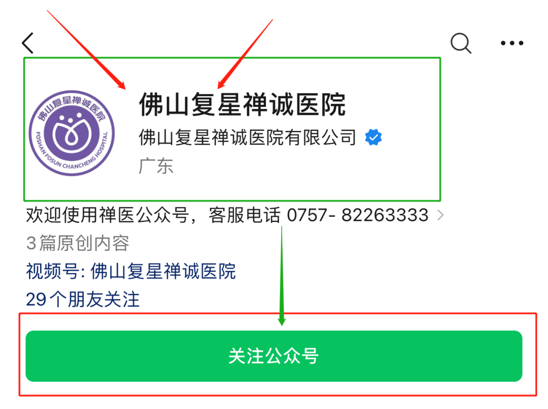 1、点击进入并关注“佛山市复星禅诚医院”公众号