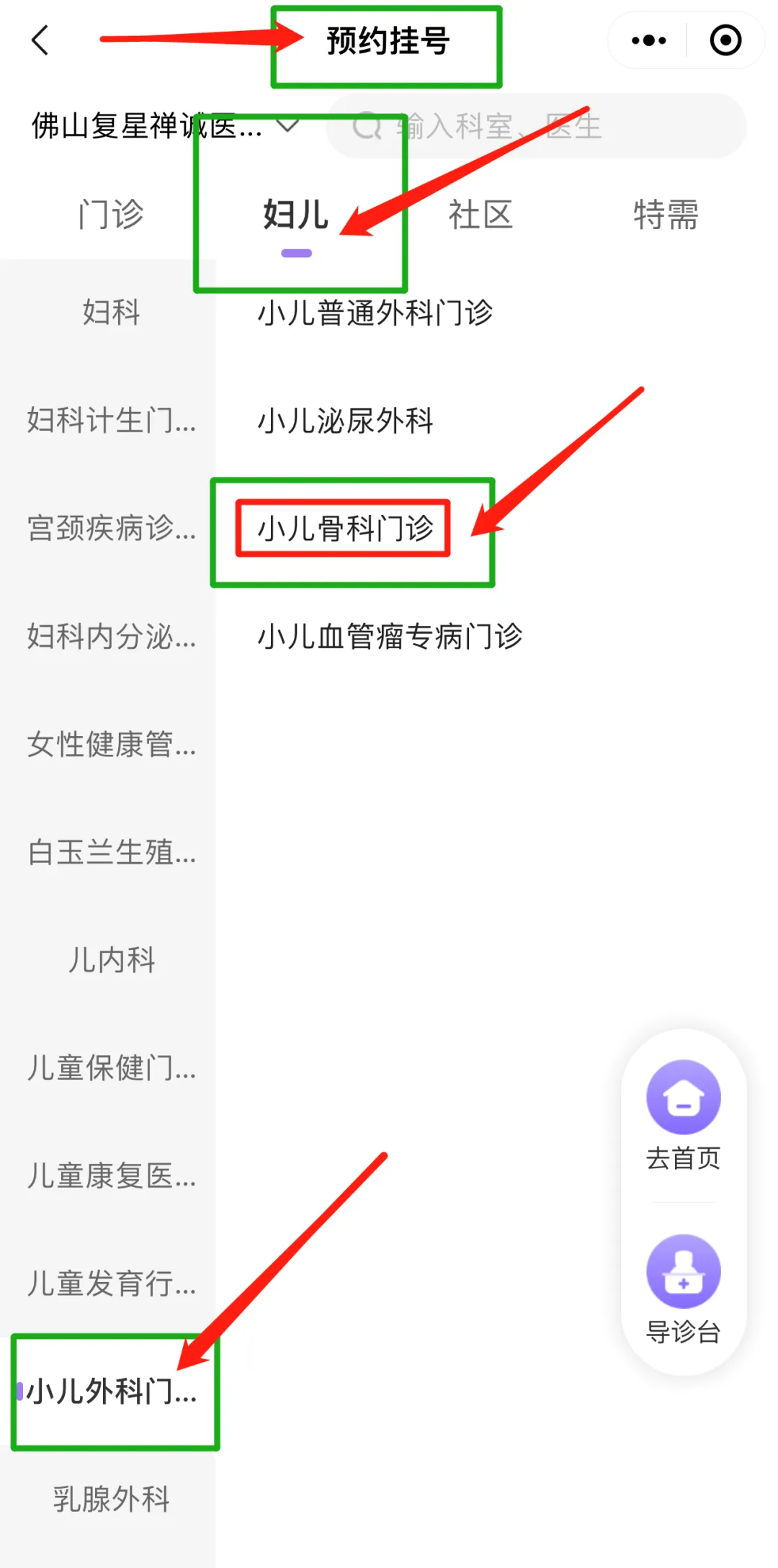 3、选择菜单“妇儿栏”—“小儿外科门诊”—“小儿骨科门诊”
